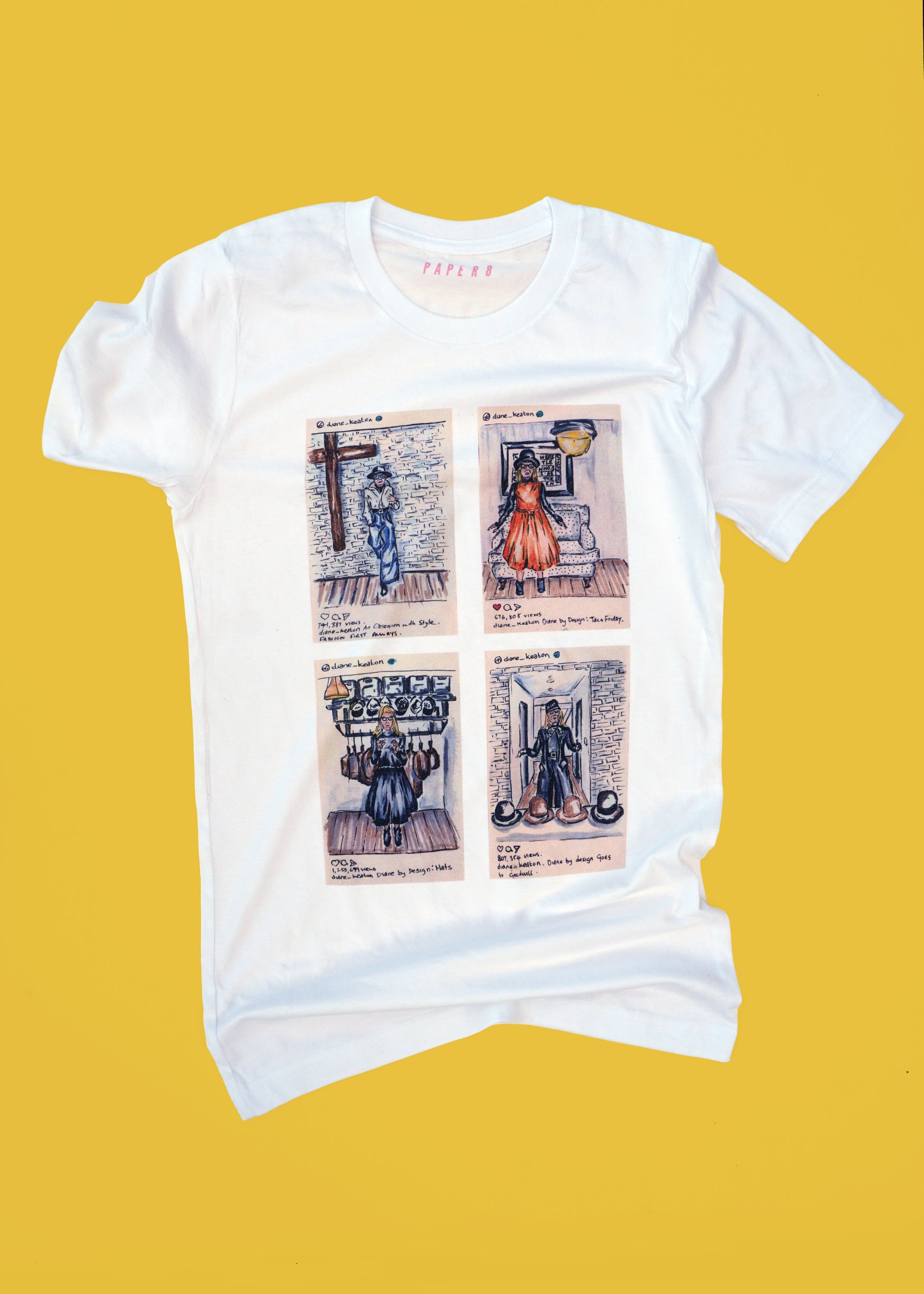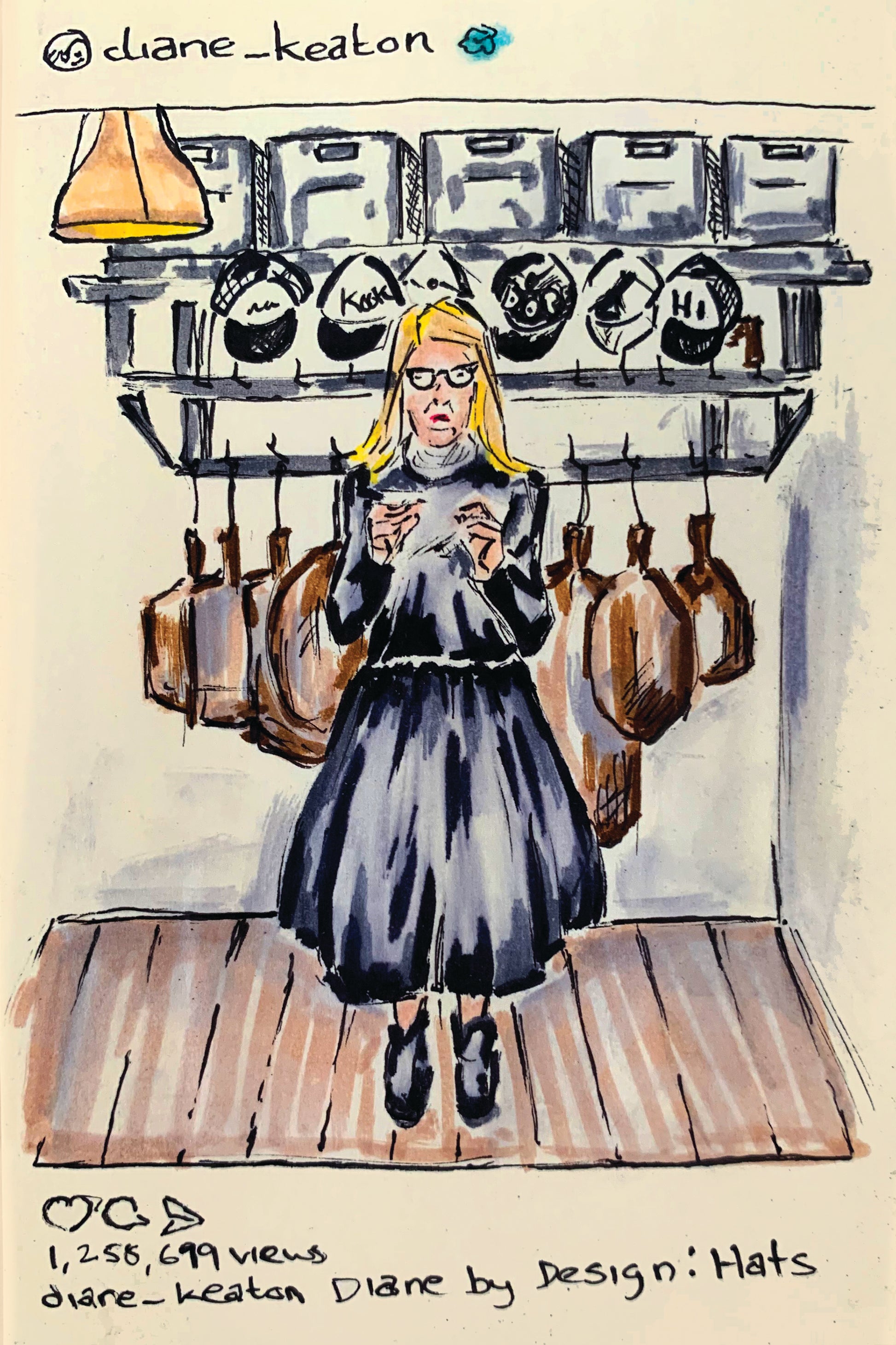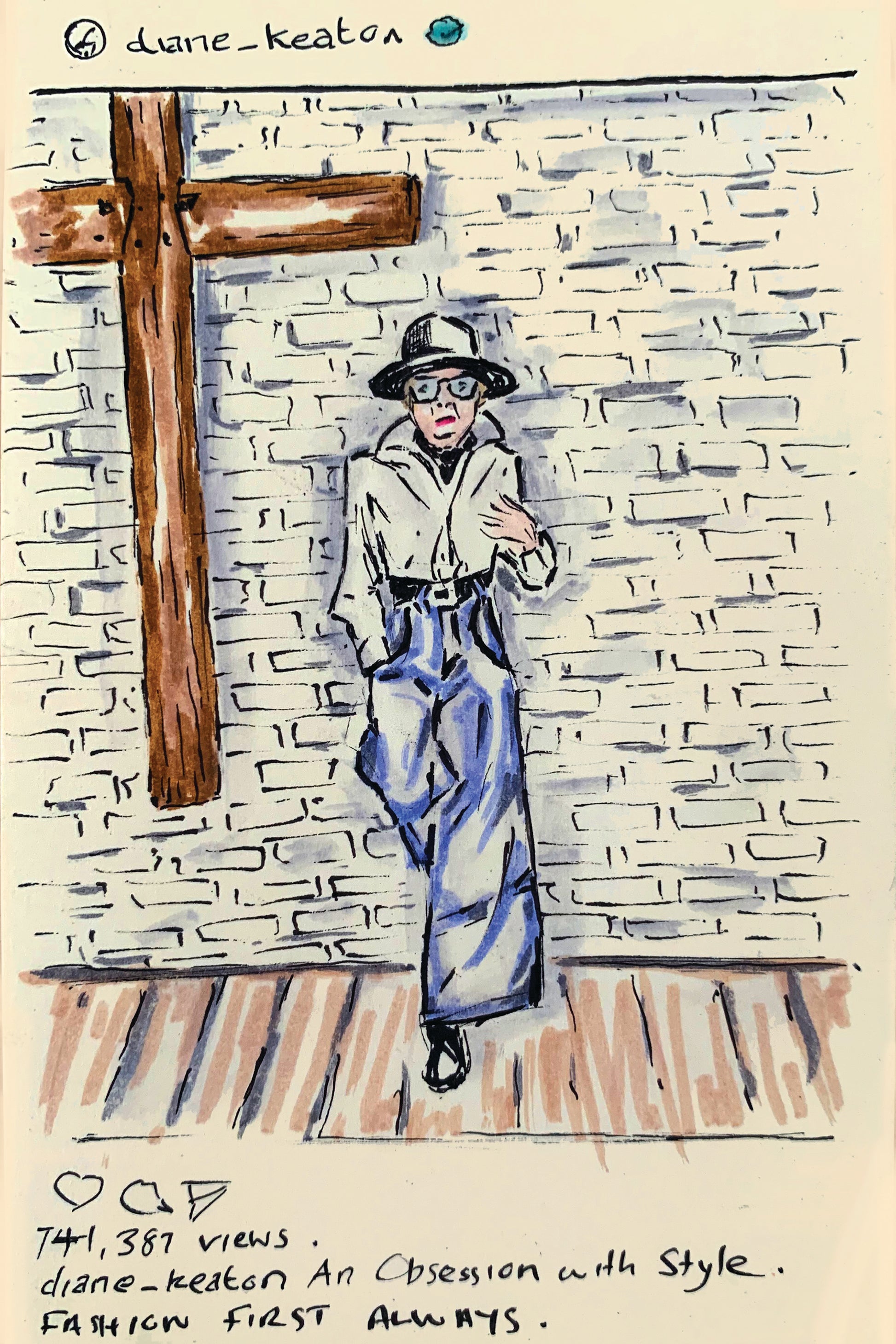 Original pen illustrations on post it of a selection of icon Diane Keaton’s Instagram posts.