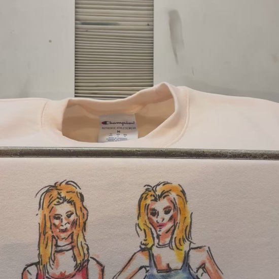 This illustration features the iconic duo of Romy & Michelle from Romy and Michele’s High School Reunion. The drawing style is loose and expressive, with watercolor-like shading and sketchy ink outlines.